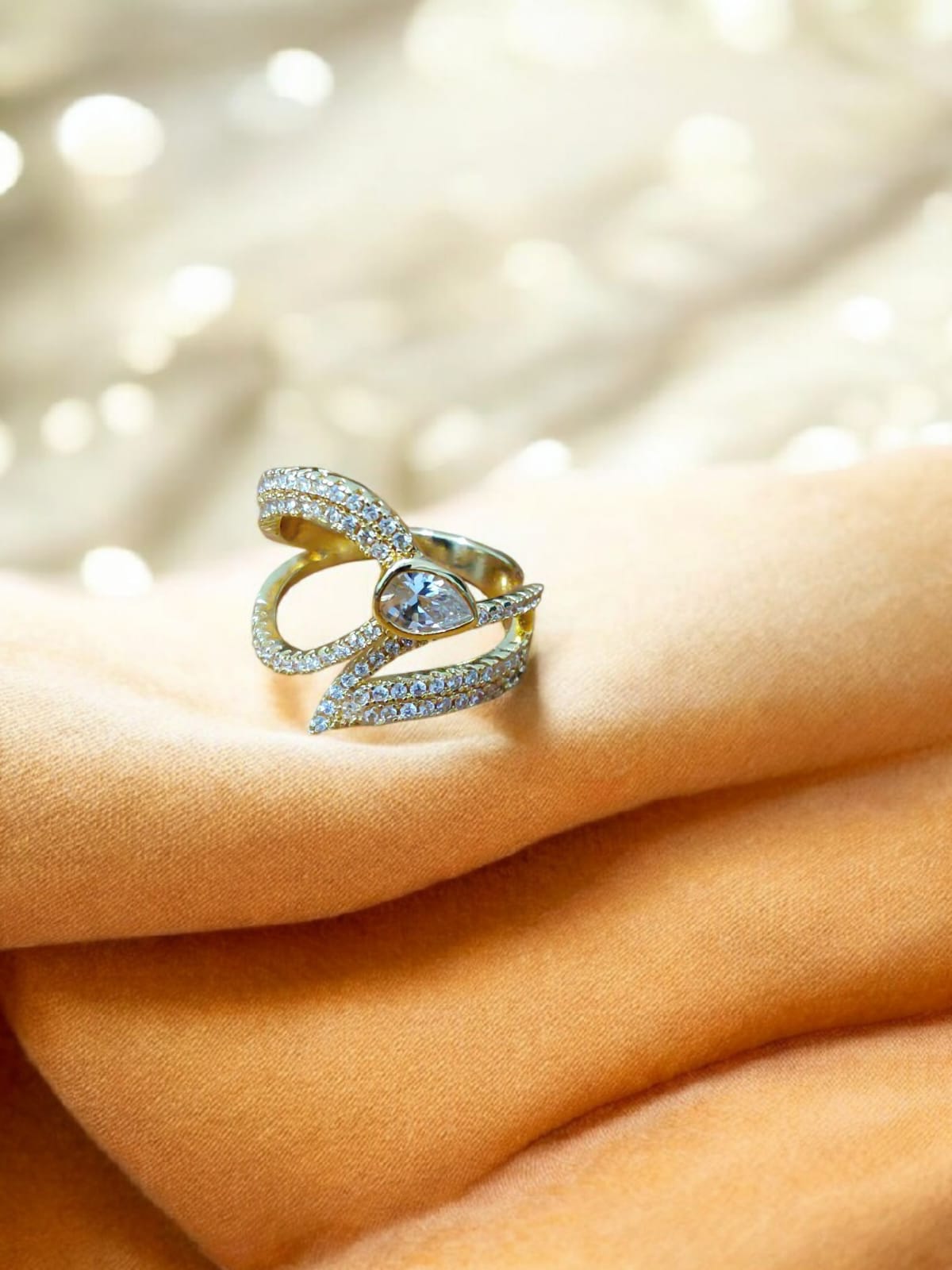 Crystal-Encrusted Gold Ring with Teardrop Stone