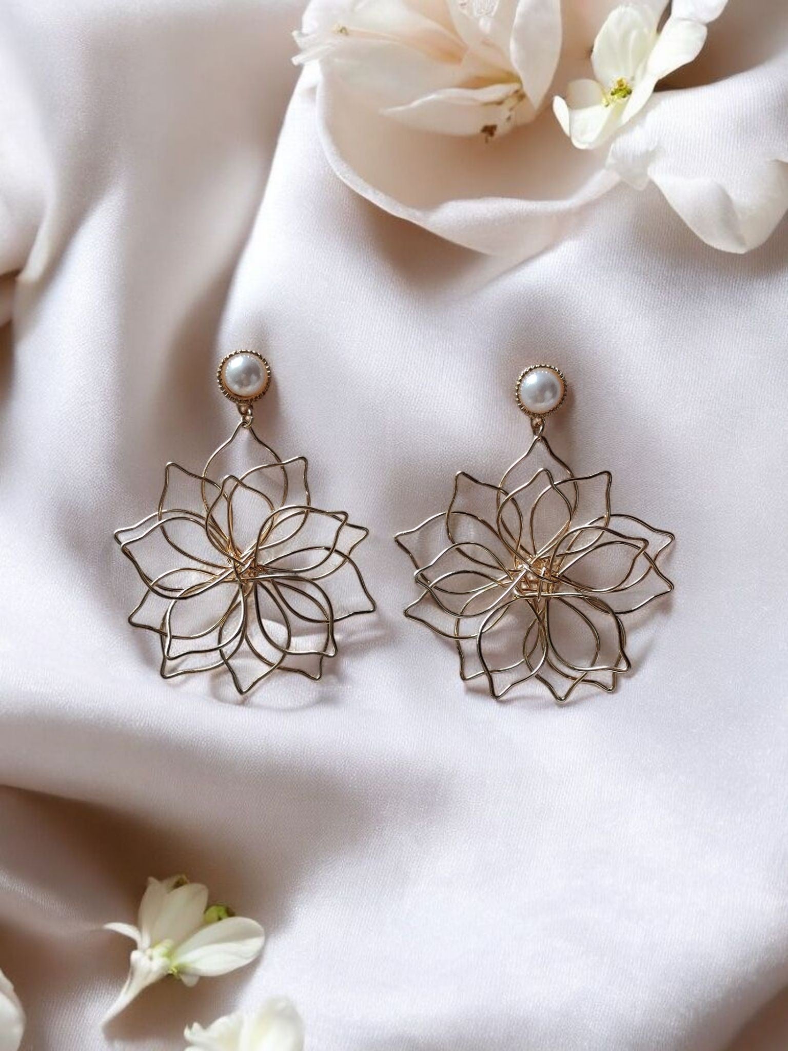 Delicate yet divine, our Divine Bloom Earrings are a poetic ode to nature’s grace. Featuring an intricate lotus-inspired openwork design, these lightweight danglers are crowned with a lustrous pearl stud — radiating timeless charm and feminine elegance. A perfect accessory for both festive flair and contemporary chic.
