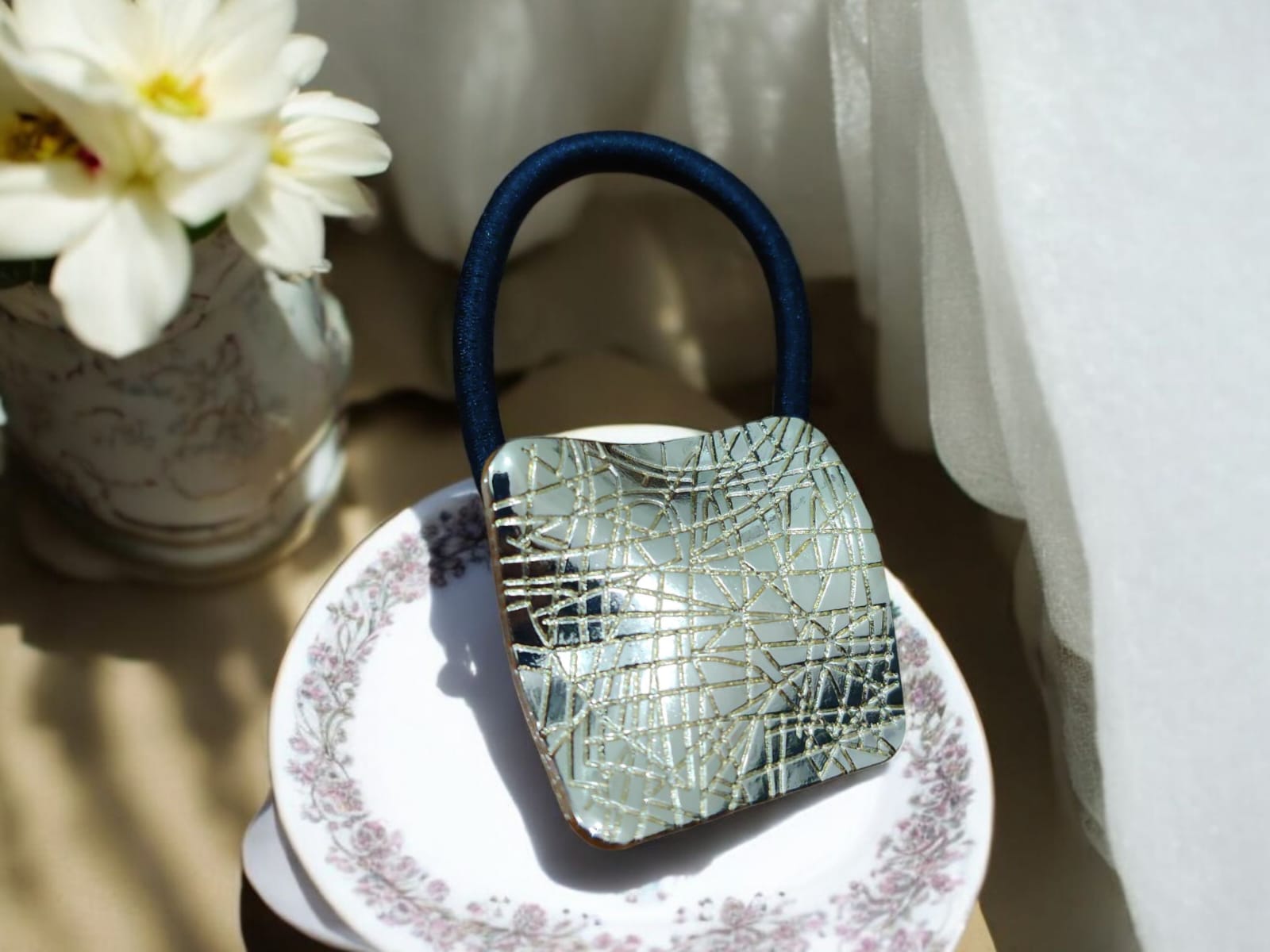 Enhance your hairstyle with this chic geometric hair tie, featuring an intricate golden-lined pattern on a metallic surface. The elastic band offers a secure fit, blending functionality with a modern, sophisticated design. Perfect for both casual and formal occasions.