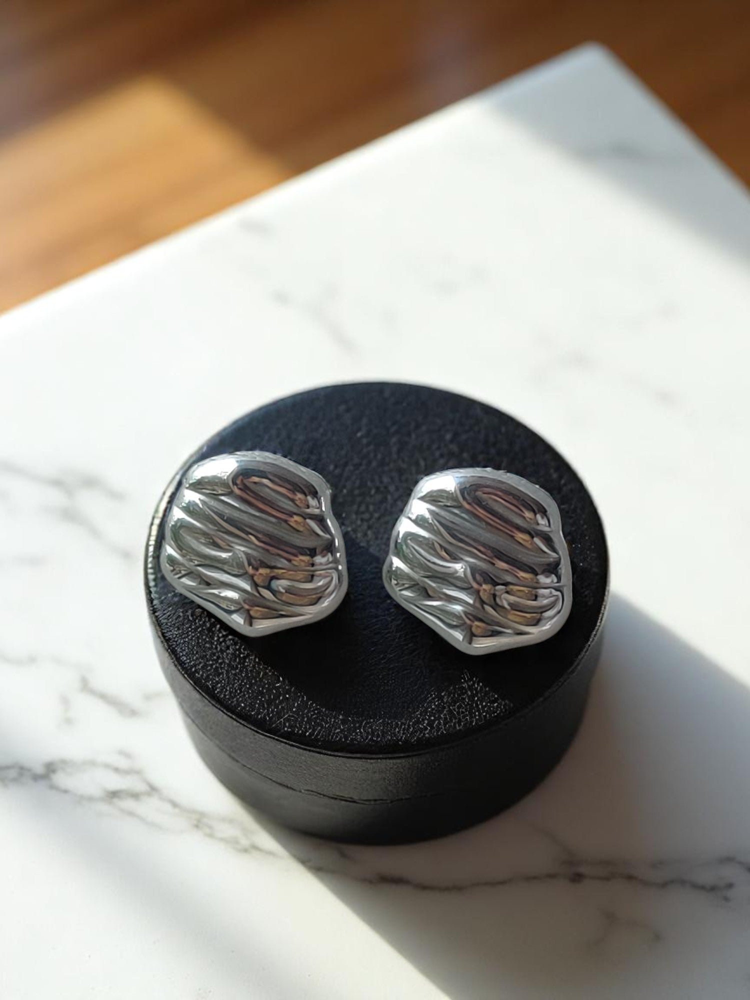 Make a statement with the futuristic flair of the Molten Chrome Studs. Crafted with an abstract, fluid texture and finished in a high-shine silver tone, these earrings exude confidence and contemporary edge. Their unique molten-metal effect reflects light with every turn, offering an avant-garde look perfect for fashion-forward individuals.