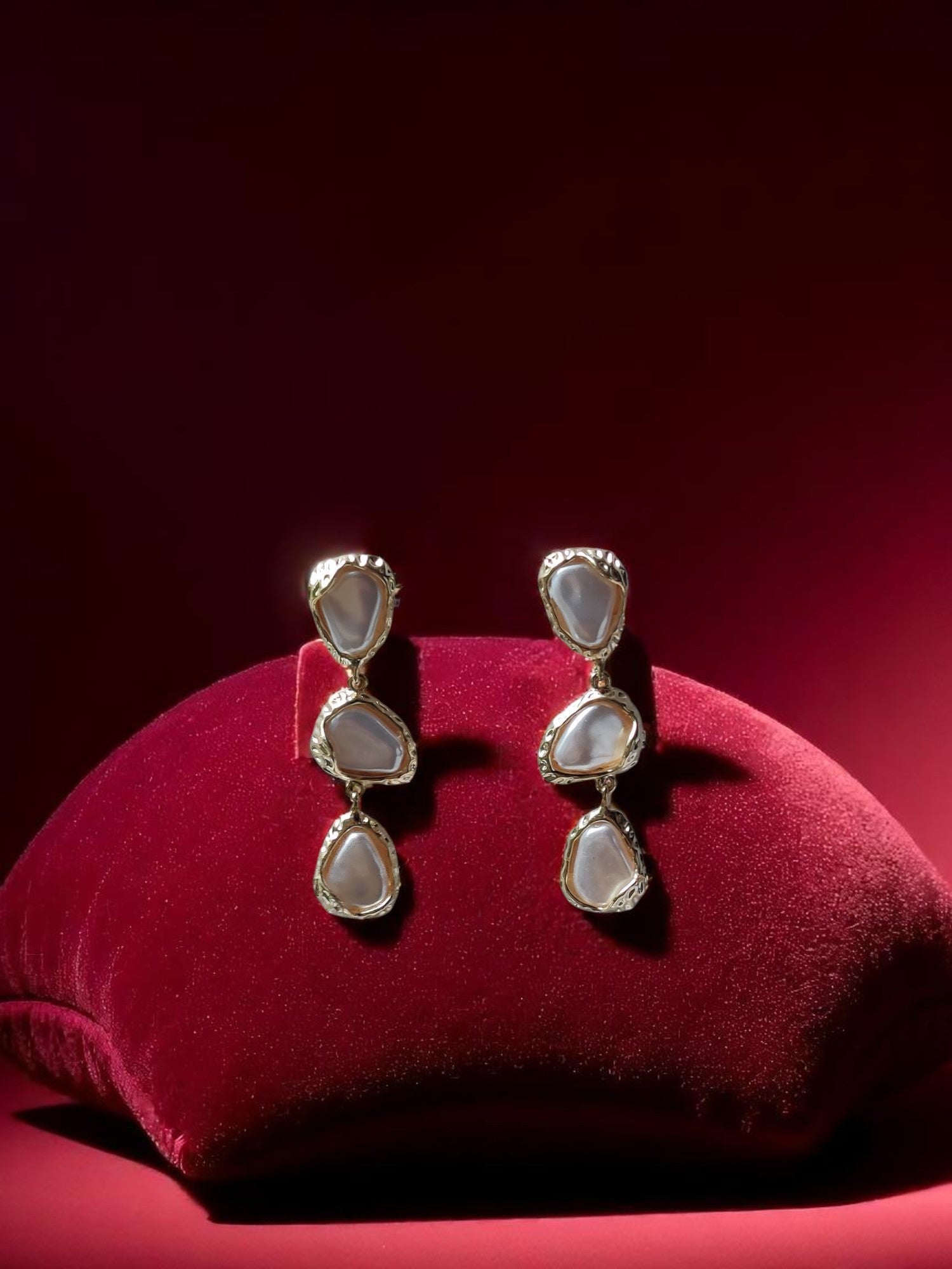 Embrace understated glamour with the Moonlit Cascade Drop Earrings. Featuring three organically shaped, pearl-like stones in a warm gold bezel setting, these earrings bring celestial elegance to your ensemble. The cascading silhouette flatters all face shapes and complements both western and ethnic styles, making them your go-to choice for day-to-night transitions.