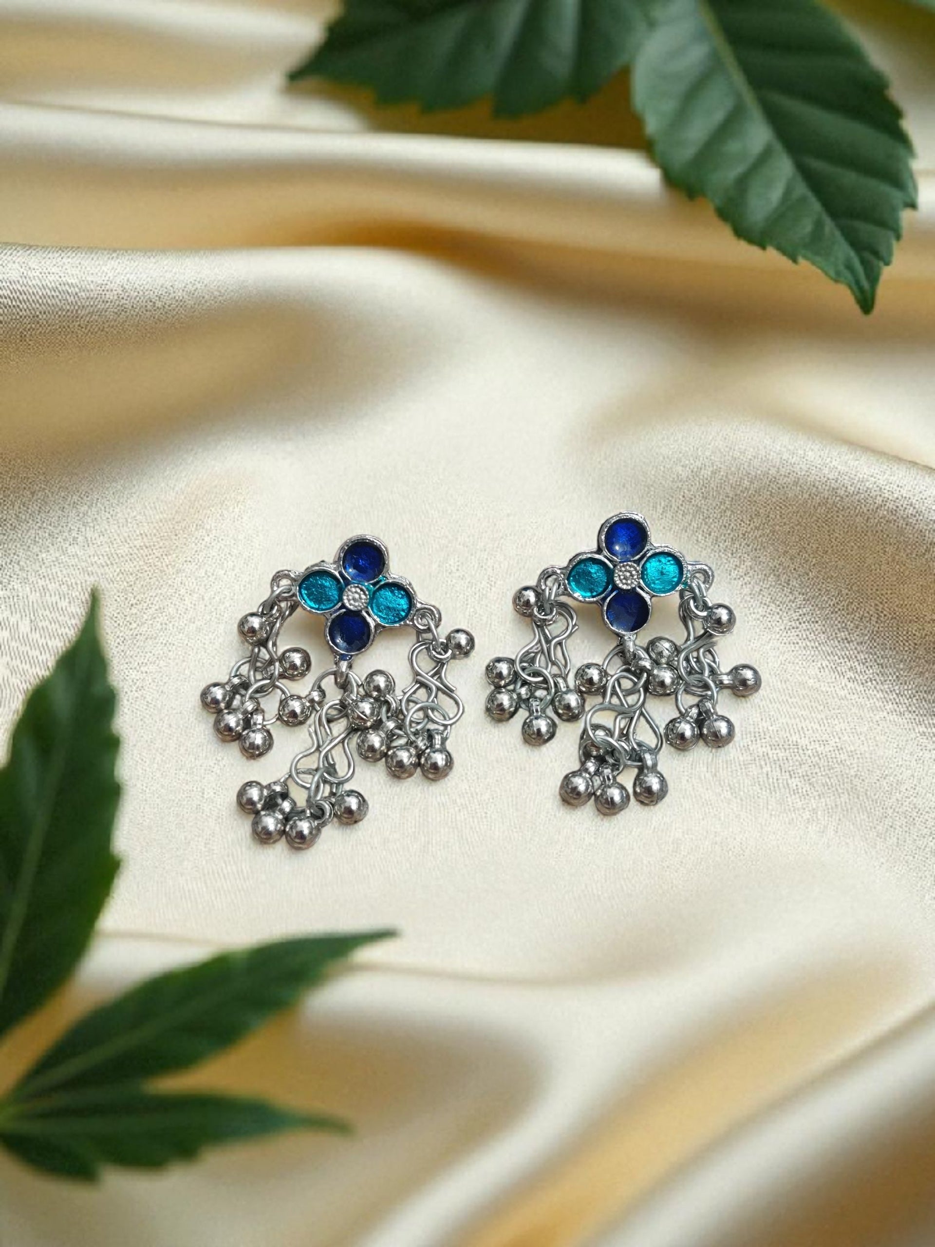 Grace your neckline with the Morni Choker Oxidized Set, inspired by the elegance of the peacock – India’s pride. This stunning handcrafted choker is adorned with turquoise and royal blue detailing, reminiscent of a morni’s (peahen’s) feathers. The oxidized silver finish brings a rustic charm, while the dangling motifs create a playful jingle with every move. Complete with matching earrings, this set beautifully complements sarees, lehengas, kurtis, and even Indo-western outfits.
