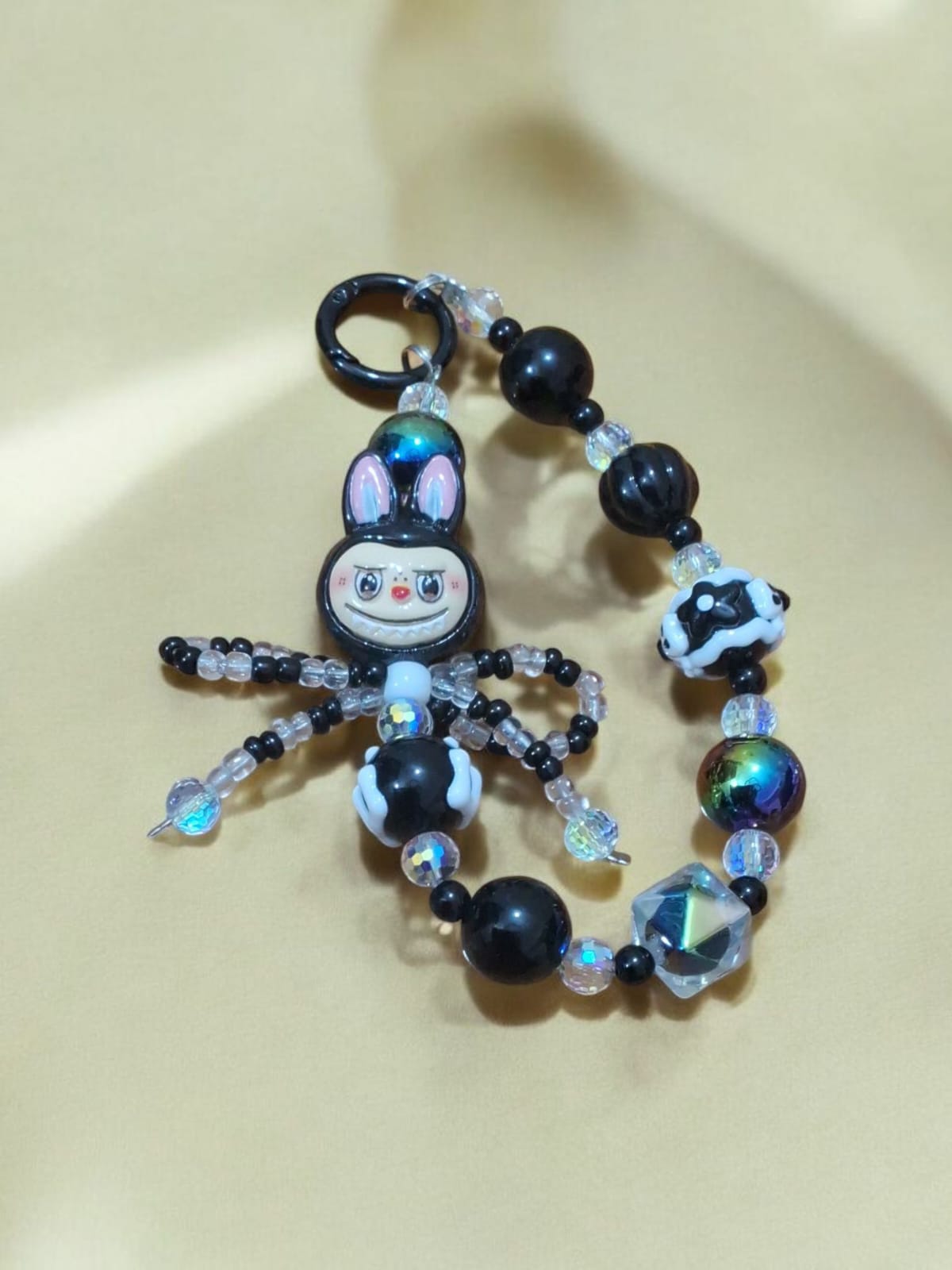 Add a pop of playful energy to your everyday with the Labubu Phone Charm! This handmade charm features a quirky bunny face with playful ears, surrounded by a mix of glossy black, holographic, and crystal-clear beads. Each bead is carefully chosen to bring sparkle and spunk—perfect for jazzing up your keys, bags, or even your Phone.