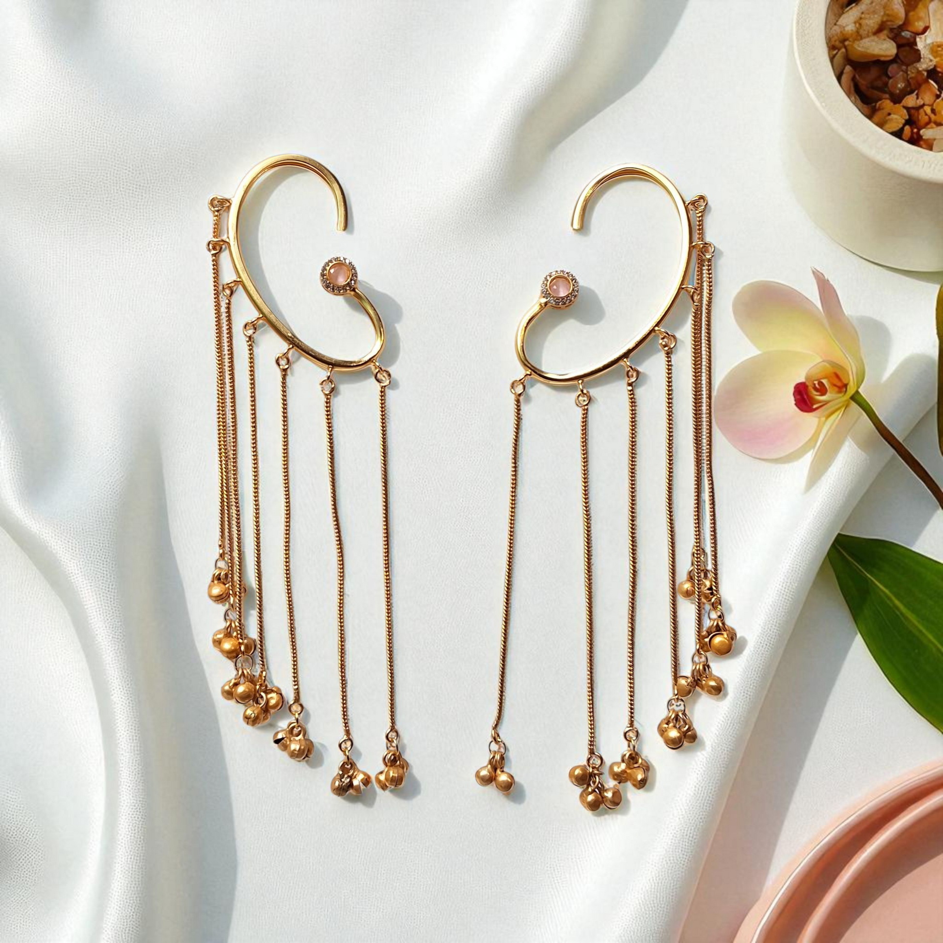 Step into a world of modern grace and rhythmic charm with the Naaya Long Drape Ear Cuffs. Designed to embrace your ear like a delicate ornament, these earrings feature a sleek open cuff, a central blush stone accent, and multiple cascading gold chains ending in soft ghungroo drops.